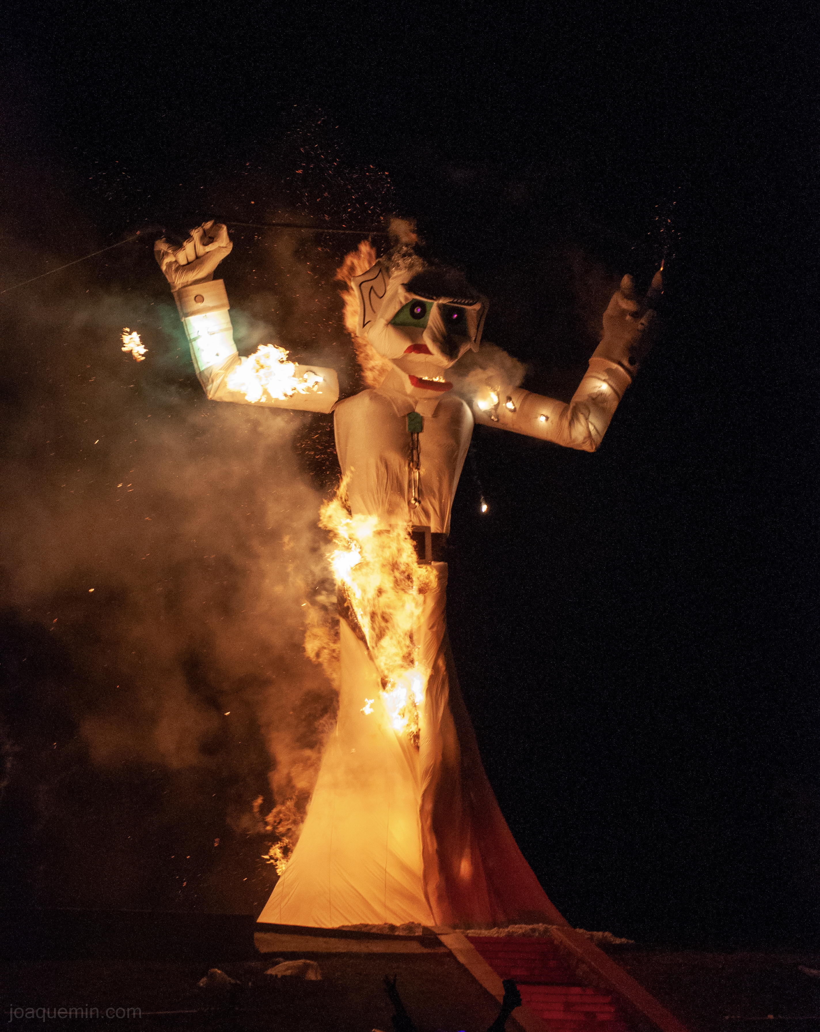 It began with the Royal Court of the Santa Fe Fiesta charging Zozobra with bringing gloom and despair to the community. The crowd began to scream, “Guilty!” and “Burn Him.” This raging mob mentality amplified as the yelling became louder and more frequent. I couldn’t help but recall stories of witch burnings and angry mobs with fire and pitchforks. The irony of the moment: as they screamed to burn this giant in order to rid the town of anxiety and fear, I myself became more anxious and fearful. The Court declared him guilty and the fire lighting was to begin. Several choreographed dance routines were performed in front of the giant puppet. One routine, performed by children playing “Gloomies,” were rescued by other dancers representing townsfolk. Another routine featured a fire spirit taunting Zozobra, dancing with flames dangerously close to his flammable paper structure. After a series of fireworks were set off around him to either intimidate or attack him, torches were placed at the bottom of his long white cloak. The crowd roared. The fire climbed up his fabric body and he began waving his arms, shaking its head, and opening its mouth with sounds of helpless agony. As the excitement of the raucous mob escalated, I became more disturbed. He burned. The crowd rejoiced.